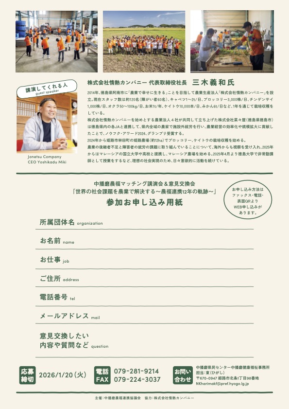 2026年2月3日(火)、兵庫県立姫路労働会館にて開催される「中播磨農福マッチング講演会」に、弊社代表の三木義和が登壇いたします 。